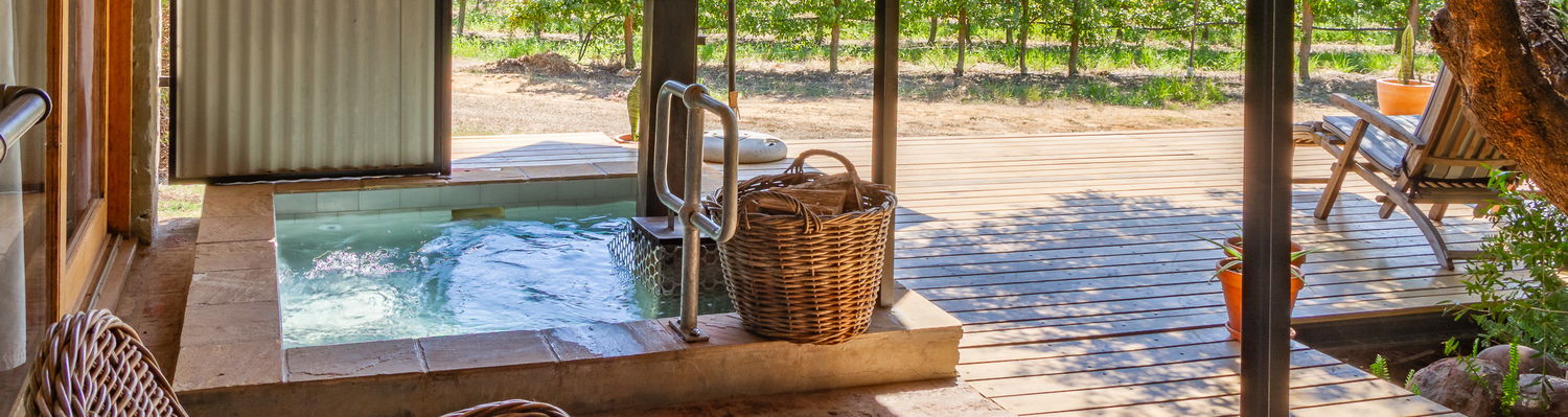Amenities: Private wood-fired hot tub, cast-iron wood-burning stove, and integrated brick/stone braai on the timber deck. (Select units feature heated outdoor showers).